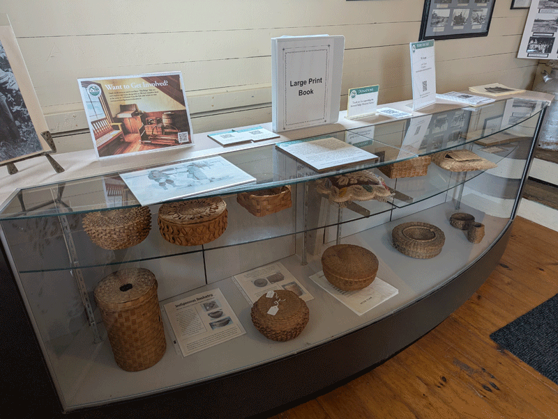 Display in the entranceway of historic basket weaving. There is a long standing relationship with the nearby Bilijk (Kingsclear) first nation community.