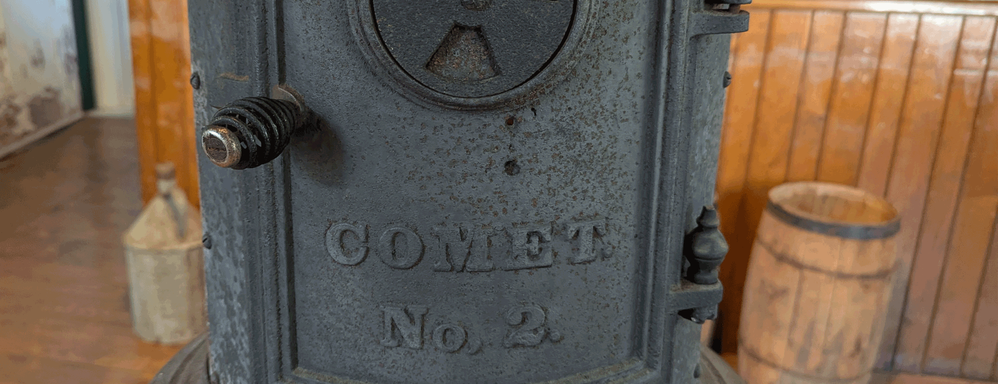 This particular woodstove, while most certainly a product from the turn of the last century, given the tall, cylindrical body, urn finial, and door draft wheel typical of parlor/column stoves of the time, is actually quite enigmatic. One would think that with “Comet No.2” stamped boldly to the front of it, that tracking down a manufacturer would be a cinch. Not so. Apparently, the name “Comet” (along with “Eclipse,” “Meteor,” “Sun,” “Gem,” “Royal,” and “Favourite” ) was used by any number of foundries in the US and Canada in the 19th Century. This appears to be a result of the “Victorian Age of Invention” (when celestial imagery made things sound more science-y) combined with non-existent, or at least unenforceable trademark laws. There were “Comet No. 2"s all over the place, and without any (as yet discovered) foundry stamps or patent marks, we’ve made the assumption that it’s not the kind of thing that was likely to be shipped long distances, and therefore relatively local.