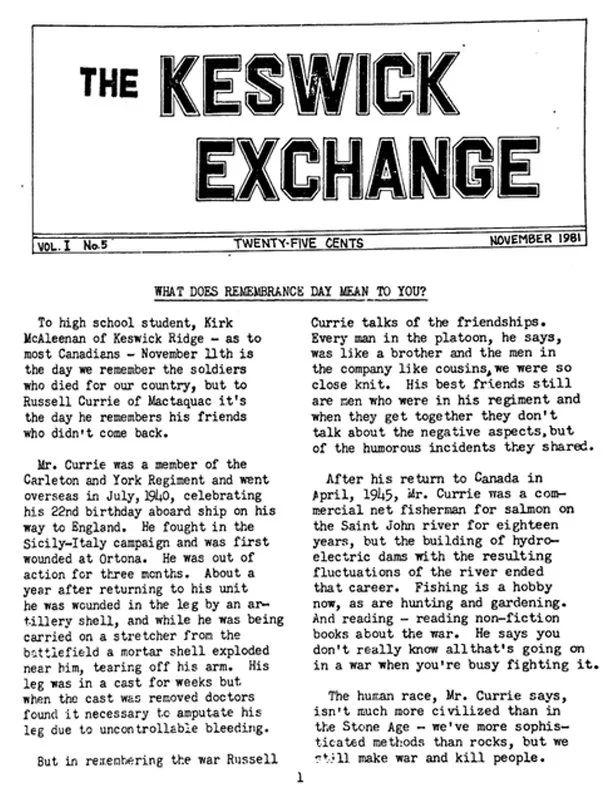 In this issue: November1981, Remembrance Day, Local Resident Honored, Local ambulance service, The horror of it all, Remembrance activities, For kids, Vanpooling, Market, Discipline, Development, Child, Malawi, CLASSIFIEDS, Apple-person, Ridge Roller Rink, Community Calendar, School phobia, cooking, FestiveFruit cake, Workers, Ridgeview Seniors, catholic, K.R. WOMEN'S INSTITUTE, CNIB Campaign, Keswick Ridge Kindergarten, 4H, Beaver, Gong Show, SUPREME COURT JUDGE HAS ROOTS ON THE RIDGE